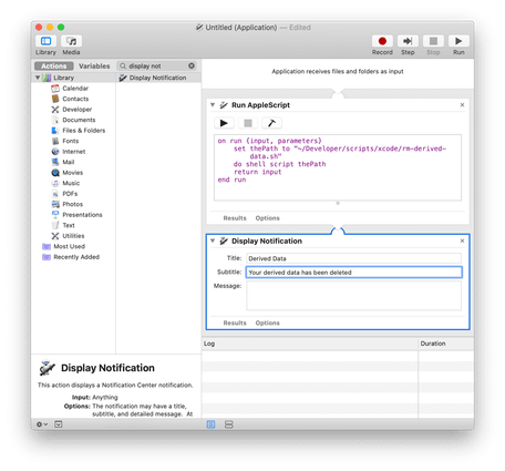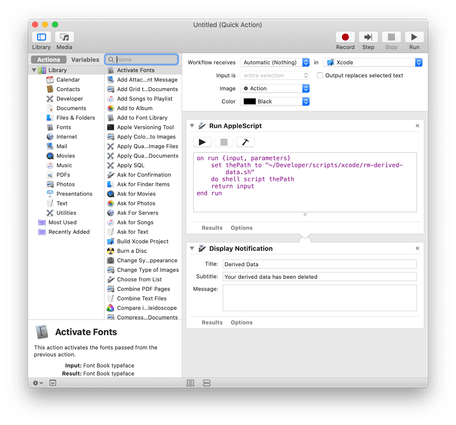 The Display Notification step is optional. I added it because I noticed that deleting Derived Data can take up to a few minutes for a large app (!) and I like to know when it’s safe to build again.